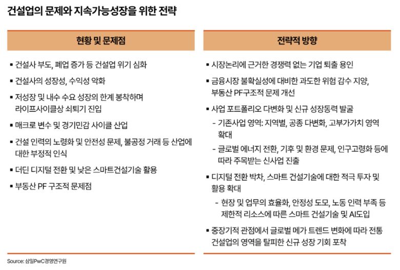 건설업 구조적 위기와 성장동력 확보 방안을 다룬 삼일PwC 보고서가 발간된 7일, 건설업의 문제점과 지속가능 성장을 위한 전략이 인포그래픽 이미지로 제시되고 있다. |