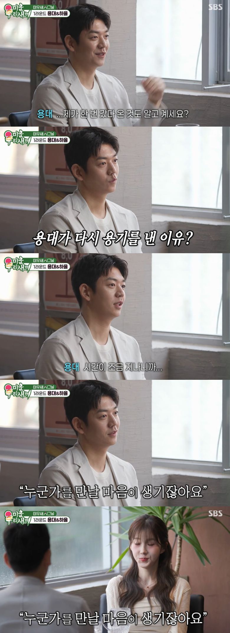 이어진 심하율과의 1:1 대화에서 이용대는 조심스럽게 진심을 꺼냈다. 그는 "제가 한 번 갔다 온 것도 알고 계시냐"고 이혼 사실을 알고 있었는지 물었고, 심하율은 "알고 있다"며 "그거(이혼)에 대해서는 크게 생각하지 않는데 궁금했던 건 용기를 낸 이유가 궁금하다"고 답했다.