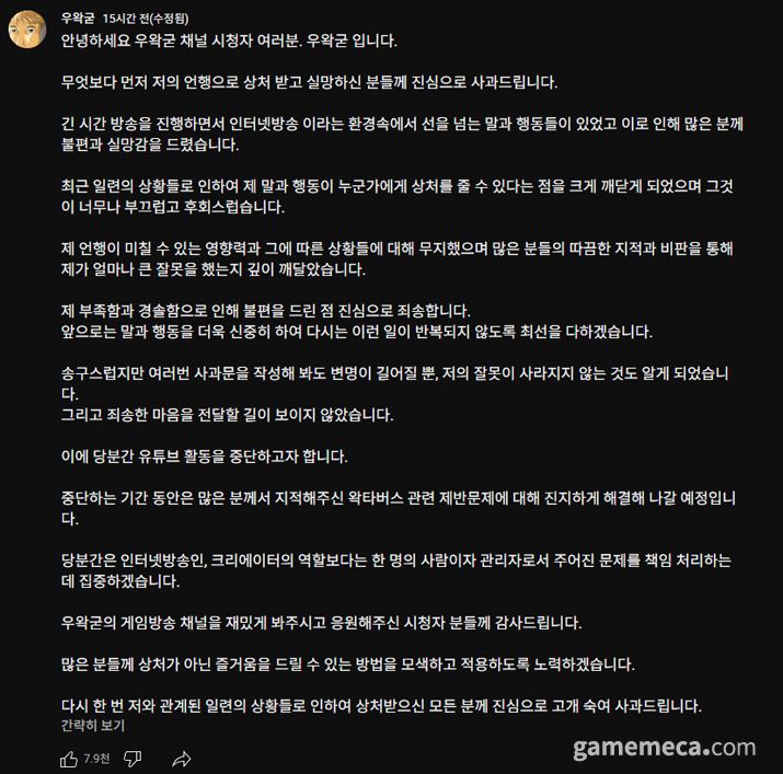 ▲ 왁제이맥스 관련 문제에 대한 우왁굳의 사과문 (자료출처: 우왁굳 유튜브 채널) |