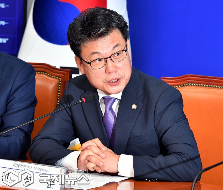(서울=국제뉴스) 진성준 더불어민주당 정책위의장이 7일 서울 여의도 국회에서 김정재 국민의힘 정책위의장을 만나 모두발언을 하고 있다./사진=이용우 기자
