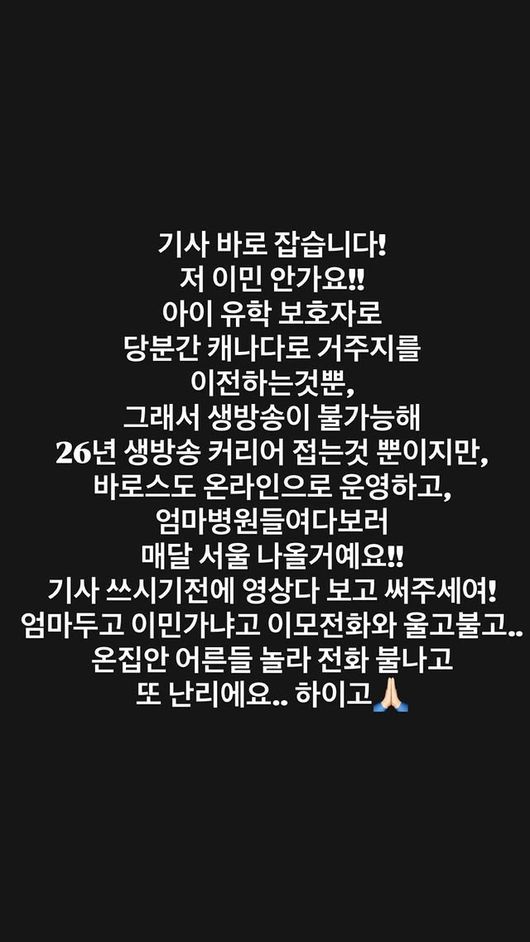 그는 "아이 유학 보호자로 당분간 캐나다로 거주지를 이전하는 것뿐"이라며 "그래서 생방송이 불가능해 26년 생방송 커리어 접는 것 뿐이지만, 바로스도 온라인으로 운영하고, 엄마 병원 들여다 보러 매달 서울 나올 것"이라고 설명했다.