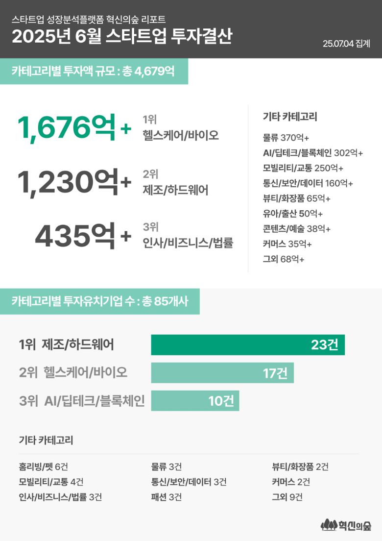이번 보고서는 성장세가 뚜렷한 투자 유치 스타트업의 36개월간 데이터를 포함하고 있으며, '2025년 6월 스타트업 투자결산' 전문은 혁신의숲 공식 홈페이지에서 확인할 수 있다.