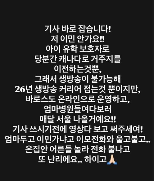 그는 "아이 유학 보호자로 당분간 캐나다로 거주지를 이전하는 것뿐, 그래서 생방송이 불가능해 26년 생방송 커리어 접는 것뿐이다"라며 온라인으로 사업을 이어가며 모친의 병원 방문을 위해 매달 한국에 올 것이라고 덧붙였다.