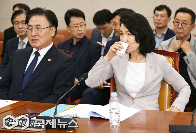 (서울=국제뉴스) 이진숙 방송통신위원장이 7일 오후 서울 여의도 국회에서 열린 과학기술정보방송통신위원회 전체회의에서 물을 마시고 있다./사진=이용우 기자
