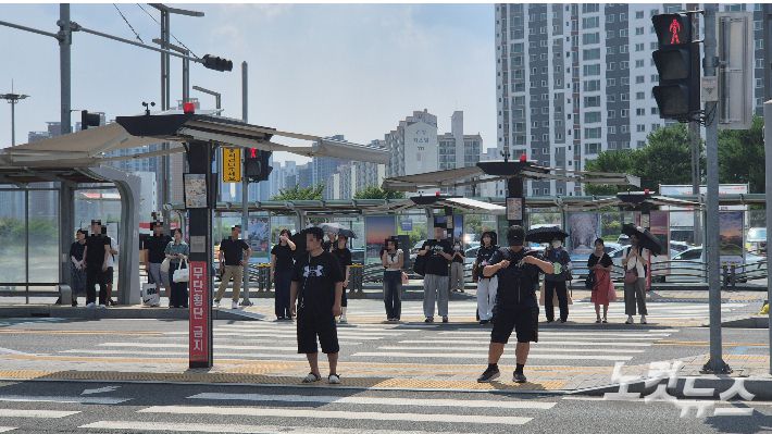 7일 오후 2시쯤 동대구역 앞 횡단보도에서 시민들이 폭염 아래 신호를 기다리고 있다. 곽재화 기자 |