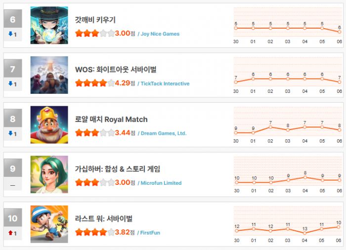 지난주 잠깐 1위를 차지하기도 했던 ‘킹샷’은 이번 주에는 4위로 소폭 하락했다. 반면, 한때 10위권 밖으로 밀려났던 ‘로얄킹덤’은 다시 5위에 진입하며 반등에 성공했다. 중위권에서는 ‘갓깨비 키우기’와 ‘WOS: 화이트 아웃 서바이벌’이 각각 6위와 7위를 유지하며 변동 없이 자리를 지켰고, ‘로얄매치’ 역시 8위에 머무르며 드림게임즈 대표작들의 안정적인 인기를 보여주고 있다.