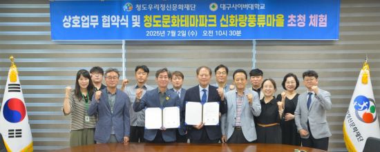 대구사이버대학교와 청도우리정신문화재단은 지난 2일 청도신화랑풍류마을 세미나실에서 지역 문화·교육 협력과 생활인구 증대를 위한 상호교류협약을 체결했다.