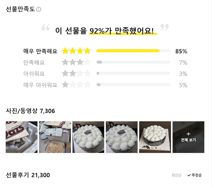 누적 후기 수는 21,300건. MD 추천 제품들과 비교해도 압도적으로 많다. 그중 사진과 동영상 후기는 7,306건으로, 전체의 34%를 넘는다. 이 정도 인증 비율은 웬만한 맛집 수준이다.