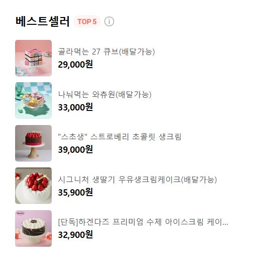 가격은 32,900원으로, TOP5 아이스크림 케이크 평균(33,960원)보다 저렴한 편이다. 만족도는 92%. 자녀가 있는 친구들에게 선물하기에 적당하다.