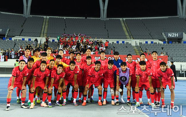 [용인(경기)=스포츠투데이 팽현준 기자] 7일 용인미르스타디움에서 열린 2025 EAFF E-1 챔피언십(동아시안컵) 대한민국과 중국의 경기, 한국이 3-0으로 승리했다. 선수들이 기념촬영을 하고 있다. 2025.07.07.
