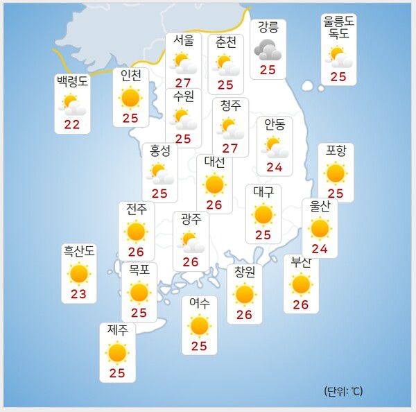 전국 주요 도시별 예상 최저 기온은 △서울 27도 △인천 25도 △춘천 25도 △강릉 25도 △대전 26도 △대구 25도 △전주 26도 △광주 26도 △부산 26도 △제주 25도 △울릉도 독도 25도다.