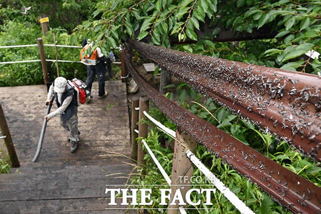 서울시 전역에서 '러브버그'가 대량 출몰하며 생활불편 민원이 폭증하고 있는 가운데 올해 상반기 가장 많은 민원을 받은 자치구는 금천구로 나타났다. 사진은 지난달 30일 오전 인천 계양구 계양산 정상에 붉은등우단털파리(러브버그) 무리가 대량 출몰한 가운데 관계자들이 방역 및 청소 작업을 하고 있다. /남용희 기자
