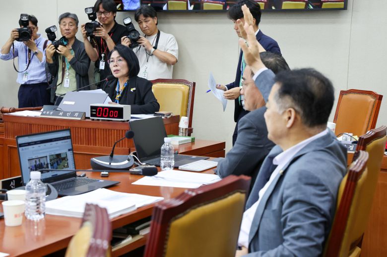 7일 오후 서울 여의도 국회에서 열린 제427회국회(임시회) 과학기술정보방송통신위원회 제1차 전체회의에서 국민의힘 최형두, 신성범 의원이 방송3법(방송법·방송문화진흥회법·한국교육방송공사법 개정안) 반대 거수 표결을 하고 있다./뉴스1 |