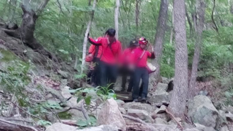 소방대원들이 돌부리 가득한 산속에서 들것을 들고 다급히 내려옵니다.
