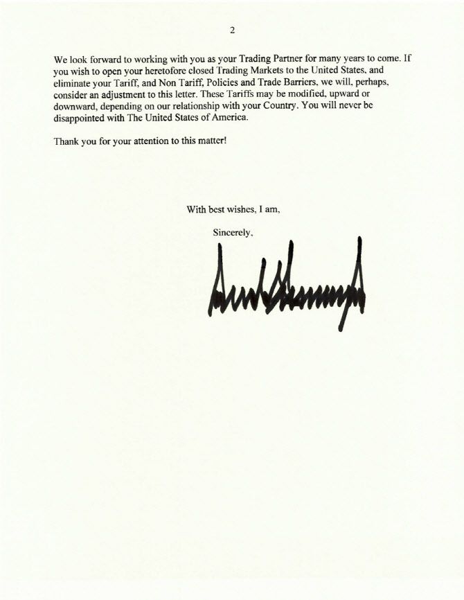 한편 트럼프 대통령은 같은 날 일본에도 8월 1일부터 동일하게 25% 관세를 부과하겠다는 내용의 서한을 전달했다. 이는 지난 4월 2일 발표된 24% 관세보다 1%포인트 상향된 수치지만, 별도의 설명은 없었다. 이 서한은 국가명과 양국 정상 이름을 제외하고는 동일한 내용이다.