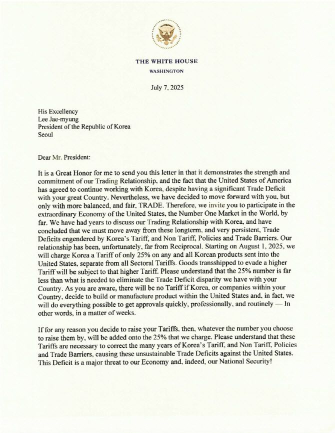트럼프 대통령은 백악관 명의의 서한에서 “미국은 오랜 기간 한국과의 무역 관계를 유지해왔지만, 불균형한 무역 적자와 상호주의에 어긋나는 관세·비관세 장벽으로 인해 더는 지금의 구조를 지속할 수 없다”고 강한 유감을 나타냈다.