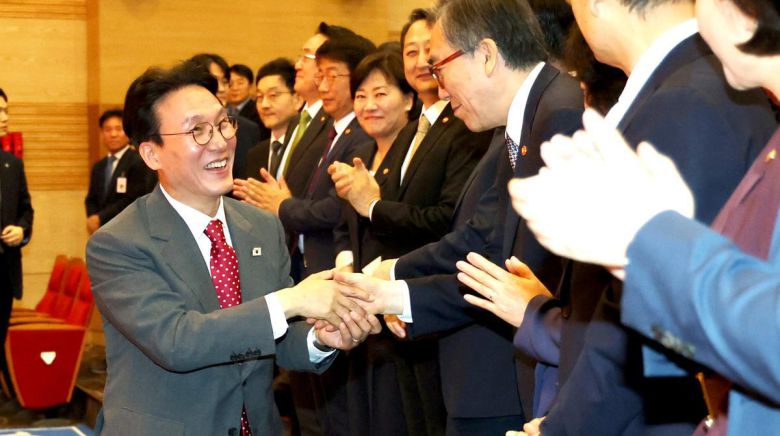 “단호하게 혁신, 품격 있게 행정” 김민석 국무총리(왼쪽)가 7일 오전 정부세종청사 대강당에서 열린 취임식에서 부처 장관들과 악수를 나누고 있다. 김 총리는 이날 취임사에서 “단호하게 혁신하되, 품격 있게 국가의 연속성을 지켜 가는 행정을 할 것”이라고 했다. 세종=뉴스1