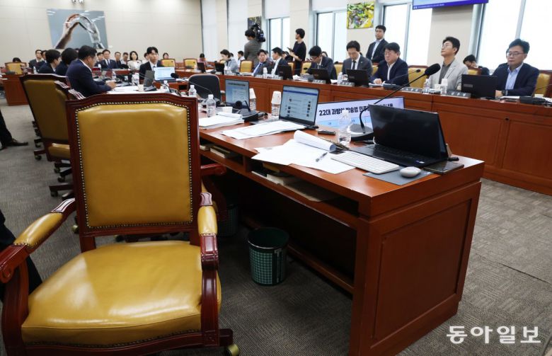 7일 오후 국회 과방위 전체회의에서 공영방송 지배구조 개편을 핵심으로 하는 ‘방송 3법’(방송법·방송문화진흥회법·한국교육방송공사법) 을 상정했다. 국민의힘 위원들은 최민희 위원장과 더불어민주당 위원들에게 방송3법과 관련해 항의하며 일시퇴장했다. 2025.07.07 이훈구 기자 ufo@donga.com |