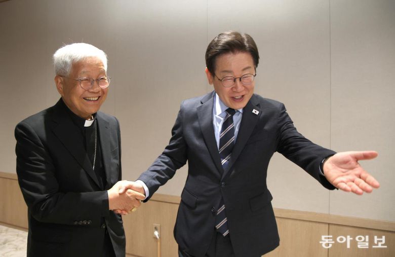 유흥식 추기경 40분 접견 이재명 대통령이 7일 용산 대통령실에서 교황청 성직자부 장관인 유흥식 추기경을 접견하고 있다. 이 대통령은 이날 유 추기경에게 “교황 레오 14세가 2027년 한국에 오시는 길에 북한도 한번 들러 보시면 어떨까 하는 생각이 들었다”라고 말했다. 송은석 기자 silverstone@donga.com
