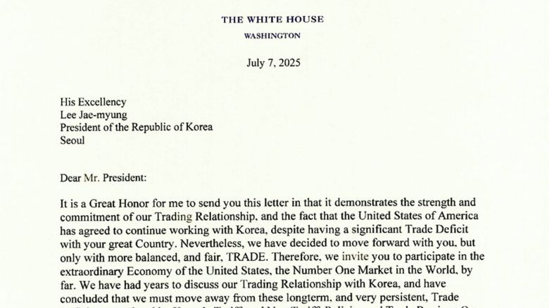 트럼프 대통령은 이재명 대통령을 수신인으로 하는 서한에서 한국에 8월 1일부터 25% 상호관세를 부과하겠다고 밝혔습니다.