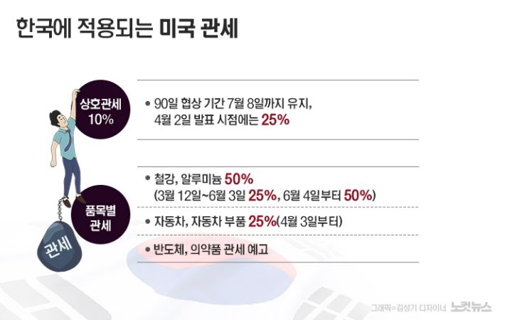 앞서 트럼프 정부는 지난 4월 각국별 상호관세를 공개했는데, 한국에는 25%의 상호관세율이 책정됐다. 여기에 철강과 알루미늄, 자동차 등 일부 품목에는 각각 50%, 25%에 달하는 별도 고율의 관세가 매겨지게 된다. 관세가 현실화 될 경우 국내 주요 사업의 타격이 불가피한 상황이다.