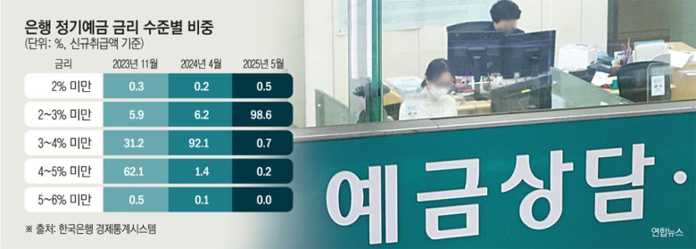 금리 구간별 추이를 보면 이런 흐름은 더 뚜렷하다. 2023년 11월만 해도 연 4~5% 미만 금리 구간 정기예금 비중이 62.1%에 달했지만 지난해 4월 1.4%로 급감했고, 올해 5월에는 0.2%까지 떨어졌다. 반면 연 2~3% 미만 금리는 같은 기간 5.9%(2023년 11월)에서 6.2%(2024년 4월)를 거쳐 올해 5월에는 98.6%까지 치솟았다.
