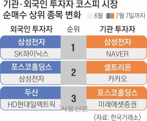 새 정부 출범 이후 국내 정책 수혜주에 집중했던 기관과 외국인들의 눈길이 미국과의 관세 협상으로 이동하고 있다. 지난 6월 한 달간 코스피 상승세를 주도했던 새 정부 정책 수혜주에서 철강과 화학, 헬스케어 등 관세 협상 타결 시 수혜가 예상되는 종목들로 옮겨가고 있다.