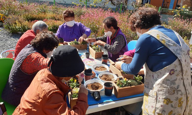 충북 진천군 ‘케어팜’에서 참여자들이 화분 등을 이용해 작물을 심고 있다. 진천군 제공 |