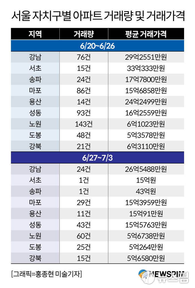 부동산 리서치업체 리얼투데이에 의하면 지난달 27일부터 이달 3일까지 서울 아파트 거래량은 577건을 기록했다. 직전 일주일(6월20일~26일) 대비 64.6% 감소했다.