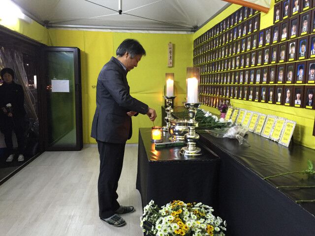 110일간의 수감 생활 끝에 나온 박래군 4·16연대 상임운영위원이 2015년 11월2일 저녁 서울 광화문 광장의 세월호 참사 희생자 분향소에 헌화하고 있다. 천주교인권위 김덕진 제공