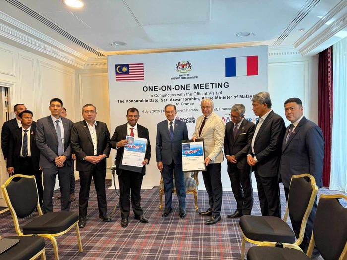 프랑스 파리에서 열린 에어아시아와 에어버스의 신규 항공기 도입 양해각서 체결식. (사진 오른쪽 네 번째부터) 크리스찬 쉬어러 에어버스 상용기 사업 부문 CEO, 안와르 이브라힘 말레이시아 총리, 토니 페르난데스 캐피털 A CEO 등 주요 귀빈이 다수 참석했다. / 사진=에어아시아 |