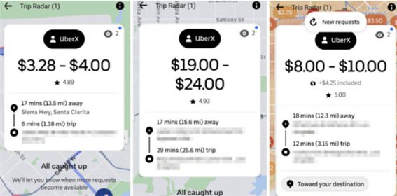 전 세계 승차공유 앱 1위를 달리는 우버가 최근에 도입한 '트립 레이더('Trip Radar)'라는 알고리즘은, 하나의 콜이 아니라 여러 건의 호출을 동시에 보여주고 클릭 경쟁으로 매칭하는 방식을 사용한다. 우버는 "운전자에게 다양한 선택지와 더 많은 콜 기회를 제공한다"고 홍보하지만 실제로는 경쟁을 부추긴다. 때로는 사고 유발의 원인이 되고 있다.