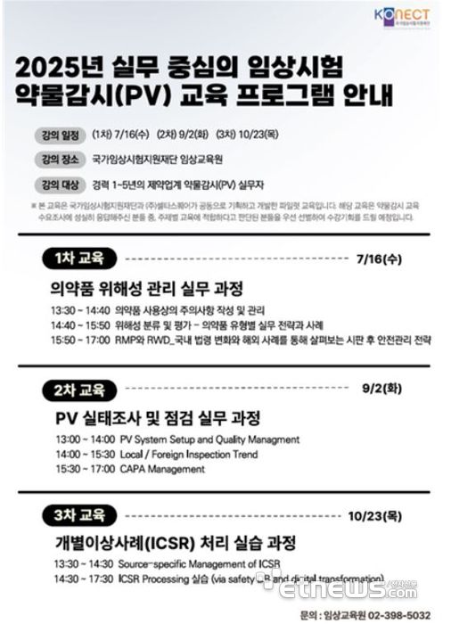 과정별 주요 내용은 △1차(7월 16일) 위해성 관리 △2차(9월 2일) 약물감시 실태조사 및 점검 △3차(10월 23일) 개별이상사례 처리 실습이다. 사전 수요조사에 응답한 인원 중 선발된 수강생을 대상으로 무료로 운영되며, 수강생 피드백은 차년도 정규과정 고도화에 반영될 예정이다.