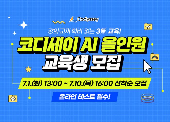 이노베이션아카데미는 '코디세이 AI 올인원'의 접수 마감일을 7월 6일(일)에서 7월 10일(목) 오후 4시까지 연장한다고 밝혔다. 한국형 AI·SW 교육 플랫폼, 코디세이 기반으로 처음 운영되는 이번 과정에 대한 높은 관심을 반영하여 선발 과정 참여 인원을 200명에서 240명으로 확대한다.