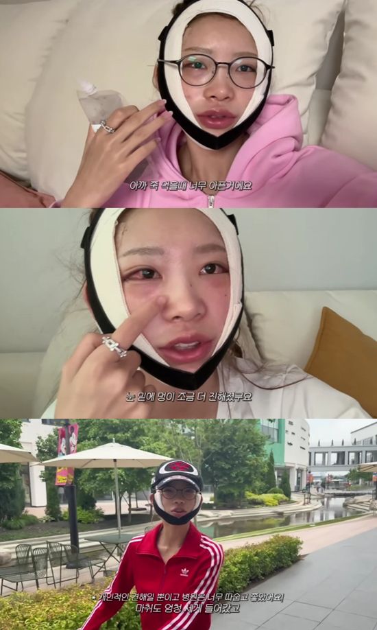 최준희는 "전체적으로 중안부가 굉장히 짧아졌다. 눈 밑 뒷트임을 같이 하면서 (얼굴) 면적 자체가 확 줄어들었고 눈이 커졌다"며 '통증이나 멍 이런 건 없다. 볼쪽을 만지면 아직 땅땅한 느낌은 있다"고 전했다.
