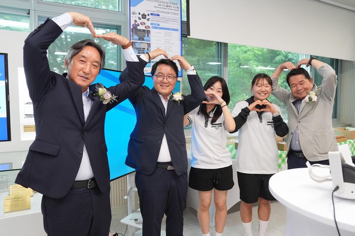 신경호 강원특별자치도교육감이  7일  강릉중앙고 반도체개발실에서 학생들과 하트를 그리며 기념촬영을 하고 있다.  사진|강원특별자치도교육청