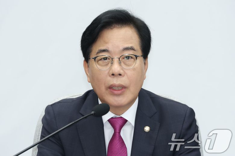 송언석 국민의힘 비상대책위원장 겸 원내대표가 8일 오전 서울 여의도 국회에서 열린 원내대책회의에서 발언하고 있다. 2025.7.8/뉴스1 ⓒ News1 이광호 기자