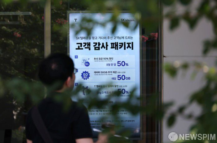 [서울=뉴스핌] 김학선 기자 = SK텔레콤이 지난 4월 발생한 해킹 사태 이후 약정 해지 가입자에 대한 위약금 면제를 결정한 가운데 8일 서울 시내의 한 SKT 매장에 '고객 감사 패키지' 안내가 붙어 있다. 2025.07.08 yooksa@newspim.com |