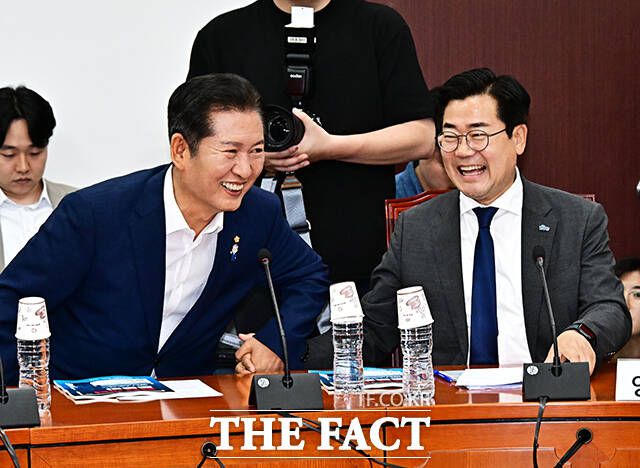 더불어민주당의 차기 당대표가 오는 8월 2일 전국당원대회를 통해 선출된다. 김민석 국무총리의 사퇴로 공석이 된 최고위원 1인도 함께 선출된다. 박찬대, 정청래 민주당 당대표 후보가 지난 2일 오후 서울 여의도 국회에서 열린 검찰개혁 토론회에 참석해 환한 미소를 지으며 인사하고 있다. /배정한 기자
