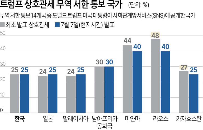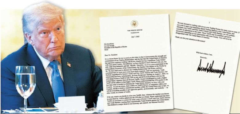 트럼프 대통령은 이 대통령에 보낸 서한에서 “우리의 관계는 유감스럽게도 상호주의와 거리가 멀었다”면서 “2025년 8월 1일부터 우리는 미국으로 보낸 모든 한국산 제품에 겨우 25%의 관세를 부과할 것이며 이 관세는 모든 품목별 관세와 별도”라고 밝혔다. 지난해 미국의 대(對)한국 무역적자는 약 660억달러, 대일 무역적자는 685억달러였다.