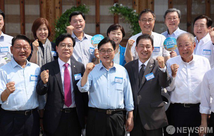 [서울=뉴스핌] 윤창빈 기자 = 우원식(아래 왼쪽 세번째) 국회의장이 8일 오전 서울 여의도 국회 사랑재에서 열린 K-바캉스 캠페인에서 송언석 국민의힘 비상대책위원장 겸 원내대표와 김병기 더불어민주당 당대표 직무대행 겸 원내대표 등 참석자들과 기념촬영을 하고 있다. 2025.07.08 pangbin@newspim.com