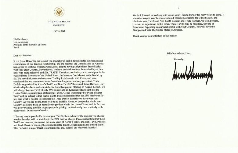 트럼프 대통령이 공개한 한국에 보낸 서한에는 “우리의 관계는 유감스럽게도 상호주의와 거리가 멀었다”며 “2025년 8월 1일부터 우리는 미국으로 보낸 모든 한국산 제품에 겨우 25% 관세를 부과할 것이며 이 관세는 모든 품목별 관세와 별도”라고 했다. 이어 “25%라는 숫자는 우리가 당신의 국가와 가지고 있는 무역적자 차이를 없애는 데 필요한 것보다 턱없이 작다”고도 덧붙였다.