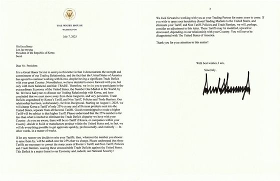 도널드 트럼프 미국 대통령이 7일(현지시간) 이재명 대통령에게 보낸 서한으로 오는 8월 1일부터 한국에 25% 상호관세를 부과하겠다는 내용이 담겨 있다. 트럼프 대통령 트루스소셜 계정 캡처. |