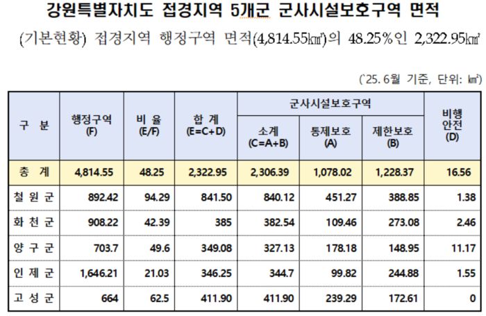 도내 군사규제구역은 접경지역 7개 시군* 중 철원, 화천, 양구, 인제, 고성 5개 군에 집중되어 있다. 5개 군의 군사규제구역 총 면적(2,323㎢)은 행정구역 면적(4,815㎢)의 48.2%에 해당할 정도이며 주민들은 영농 활동, 건축, 재산권 행사 등 일상생활에서 심각한 제약을 받고 있는 실정이다.