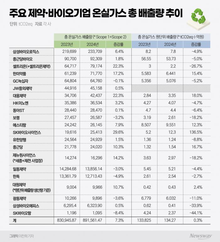 지난해 국내 제약바이오 기업 중 삼성바이오로직스의 온실가스 배출량이 가장 많은 것으로 나타났다. 원단위 배출량은 종근당바이오가 가장 높았다.