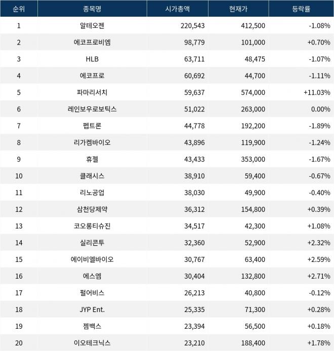 한편 시가총액 20위권 종목들은 리노공업(058470) ▼0.40%, 삼천당제약(000250) ▲0.39%, 코오롱티슈진(950160) ▲1.08%, 실리콘투(257720) ▲2.32%, 에이비엘바이오(298380) ▲2.59%, 에스엠(041510) ▲2.71%, 펄어비스(263750) ▼0.12%, JYP Ent.(035900) ▲0.28%, 젬백스(082270) ▲0.18%, 이오테크닉스(039030) ▲1.78% 등의 성적을 기록하고 있다.