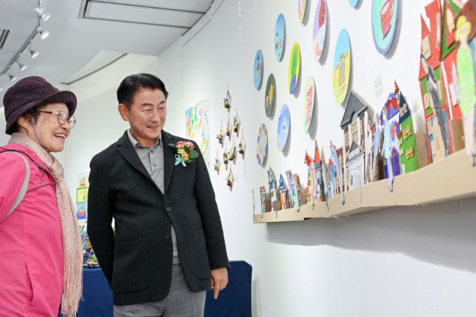 의정부노인종합복지관에서 열린 제20회 회룡시니어전시회에서 김동근 의정부시장이 지역 어르신과 작품을 감상하고 있다. /사진제공=의정부시 |
