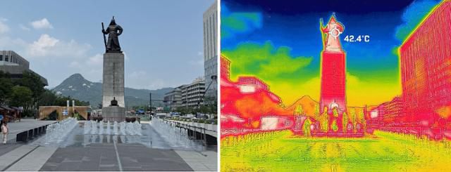 서울 한낮 기온이 37.7도까지 오른 8일 열화상카메라로 촬영한 서울 광화문 광장. 이순신 장군상 온도가 42.4도까지 기록한 모습이다. 최주연 기자 |