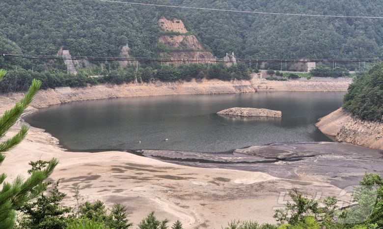 8일 강원 강릉시 성산면 오봉저수지 수위가 낮아지며 바닥을 드러내고 있다. 이날 기준 해당 저수지 저수율은 32%로, 전국 평균(62.2%)보다 현저히 낮은 수준을 보이고 있다. 2025.7.8/뉴스1 ⓒ News1 윤왕근 기자