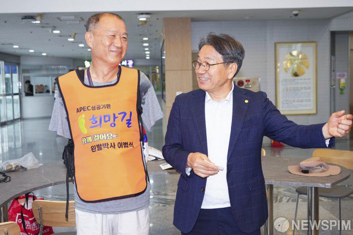 [광주=뉴스핌] 이휘경 기자 = 강기정 광주시장이 8일 오전 시청 1층 열린문화공간에서 '2025 경주 APEC(아시아태평양경제협력체) 성공 개최'를 기원하며 왼발 도보 종주에 나선 이범식(60)씨를 만나 성공 종주를 응원하고 있다. 이씨는 8일 광주시청에서 출발해 오는 27일까지 21일간 경주까지 400km를 걸으며 APEC 성공개최를 기원하고 동서 지역간 화합의 메시지를 전달한다. [사진=광주광역시] 2025.07.08 hkl8123@newspim.com